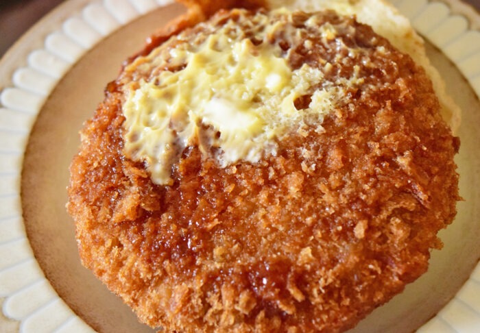 ボリューム満点のメンチ。メンチの重量感が凄いです。メンチ自体はつなぎの量が多めのためか、肉っぽさはそこまで感じません。からしマヨネーズは特に辛くなく、あまり強調していない模様。