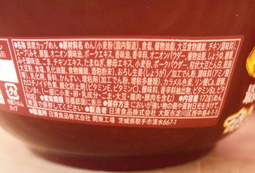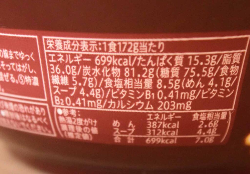 1食(172g)当たり699kcal。炭水化物は81.2g(糖質75.5g・食物繊維5.7g)食塩相当量は8.5g(めん4.1g・スープ4.4g)。カロリーと食塩がやばいですね…
