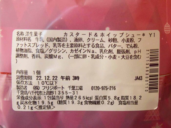 一方、「シューパティシエール」はクリスマスを意識した袋でした。購入時期がクリスマスだったのでこのようなパッケージですが、普段はパッケージの色合いが少し異なるようです。1個当たり172円(税込)とこちらの方が少しお高め。