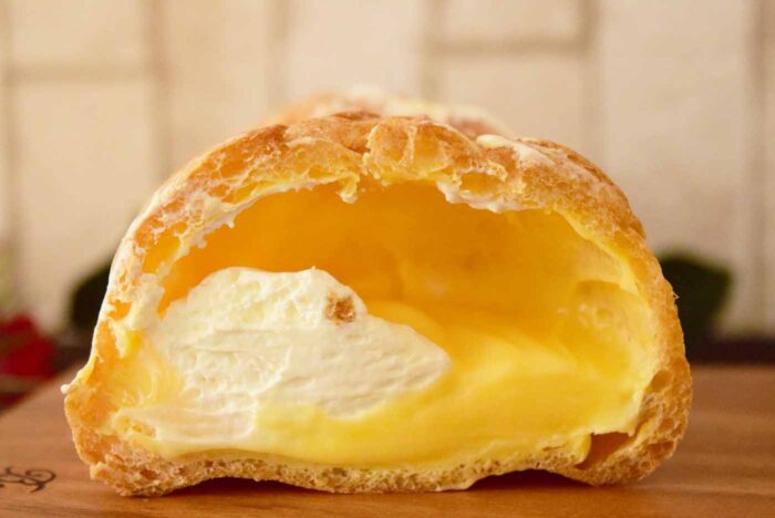 皮の中にはホイップとカスタードのダブルクリームがギッシリ詰まっています。ホイップクリームは軽く、甘さは控えめです。一方、カスタードクリームは甘く、なめらかな食感でした。皮は薄く、あくまでもクリームがメインといった感じですね。2種類のクリームは甘さと食感のバランスが良い一品。