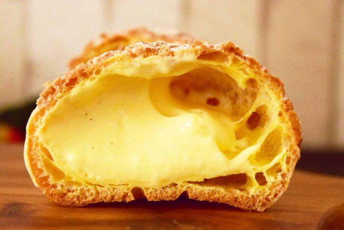 バニラビーンズが混ざったカスタードクリームがギッシリ詰まっています。クリームの食感はドロドロしていて濃厚な感じがします。甘さは控えめで、クリーム自体は思ったよりも軽いです。もう少し卵っぽさやバニラビーンズの香りがすると思いましたが、両方ともかなり弱かったのが残念なところ。シュー皮はしっとりしていて、クッキー皮?と思ってしまうような出来栄えでした。
