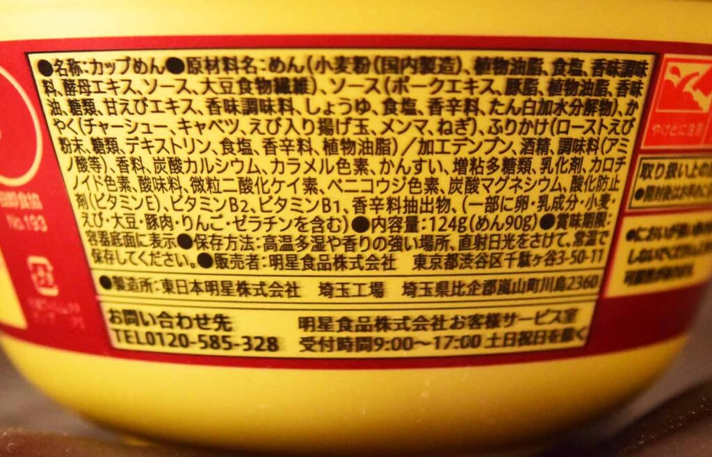 かやくは「チャーシュー、キャベツ、えび入り揚げ玉、メンマ、ネギ」が入っています。チャーシューやキャベツの量はそれなりですが、えび入り揚げ玉の量は多く、ソースとの相性もバッチリでかなり美味でした。