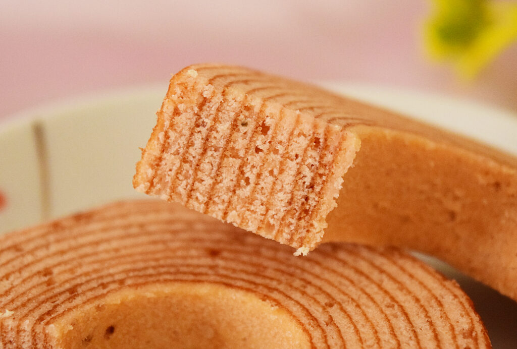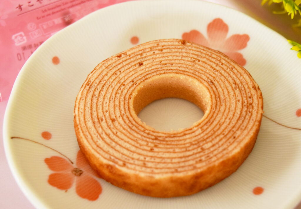 一口食べた食感はしっとり。安いバームクーヘンにありがちなパサパサ感は一切ありません。桜の酸味や味はほんのり程度で若干の塩っ気を感じます。桜の風味より、卵の風味を強く感じました。