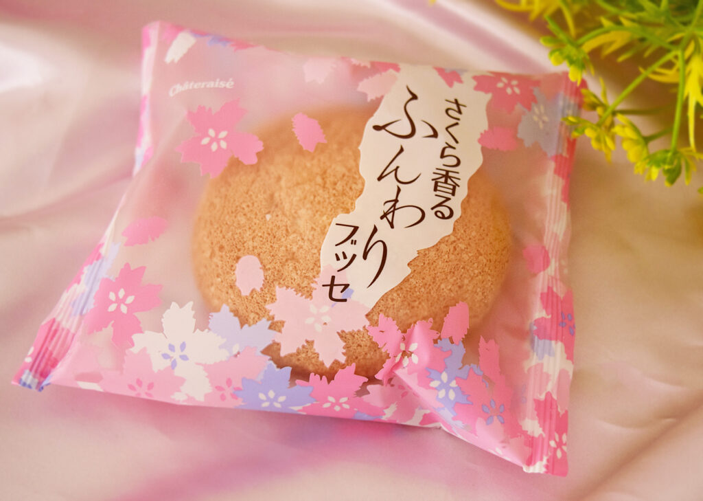 桜の花が描かれたパッケージに入った「さくら香るふんわりブッセ」108円(税込)。