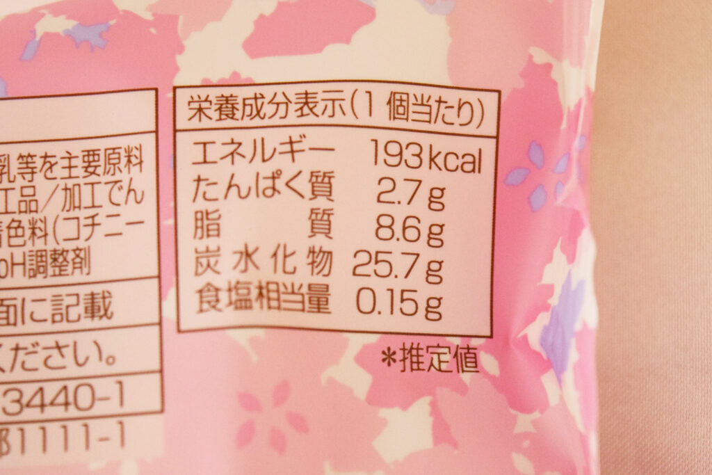 1個あたり193kcal。炭水化物は25.7gで食塩相当量は0.15gです。