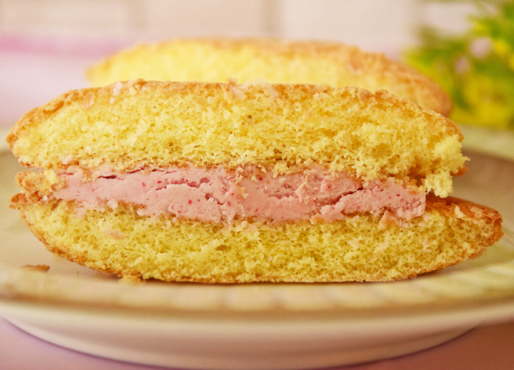 淡いピンク色のクリームはあまりさくらの味が薄め。ブッセの甘さが目立つので、さくらクリームの甘みはあまり感じません。