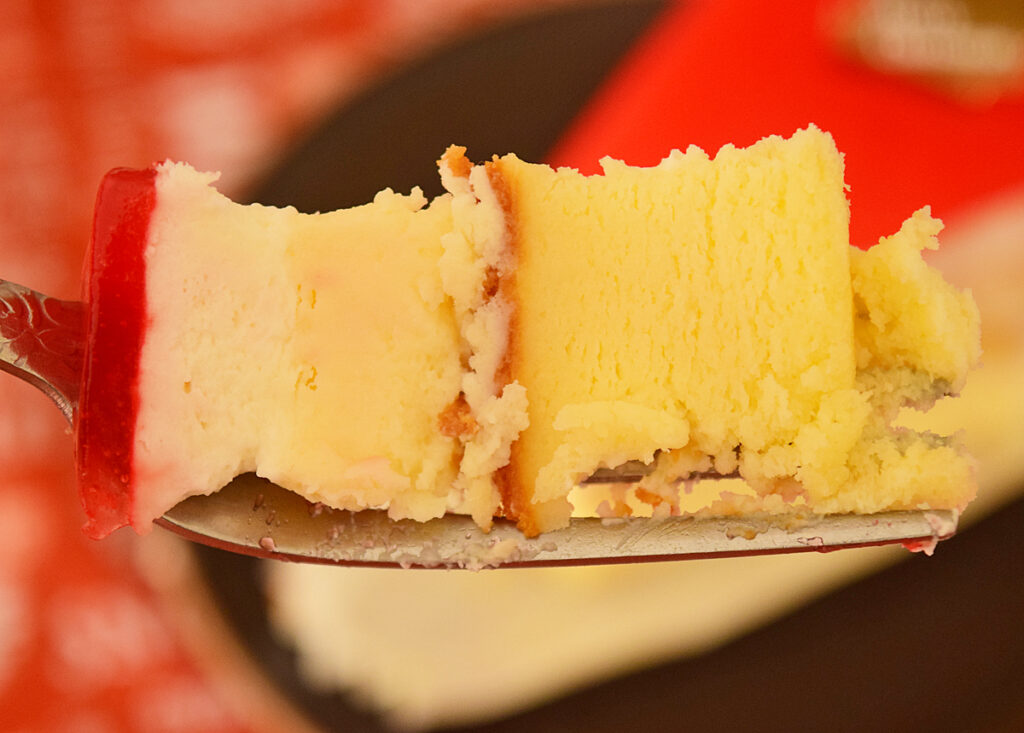 フォークで上から下にとカットしてみると、スフレチーズ部分だけが分離しそうになりました。終始スフレチーズのみ分離しかけるので、食べる時には注意を。
