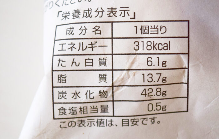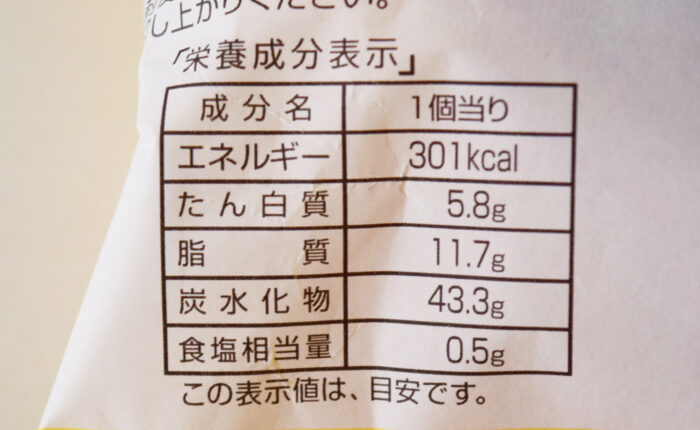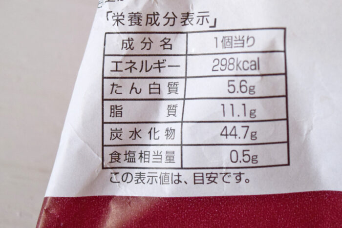 1個当たり298kcal。炭水化物は44.7gでした。しあわせ届けるくりぃむぱんシリーズは季節限定品が多いので、同時期に全てそろえるのは困難ですね…
