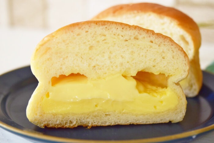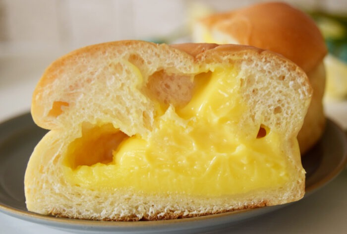 半分に割ってみました。はちみつが混ざった黄色カスタードがギッシリ詰まっていますね。蜂蜜の香りが口いっぱいに広がります。カスタードの味はあまり強くなく、どちらかというとメープルに近い味わいです。パン生地はねっちょっとしていて、食べ応えがあるのが特徴です。