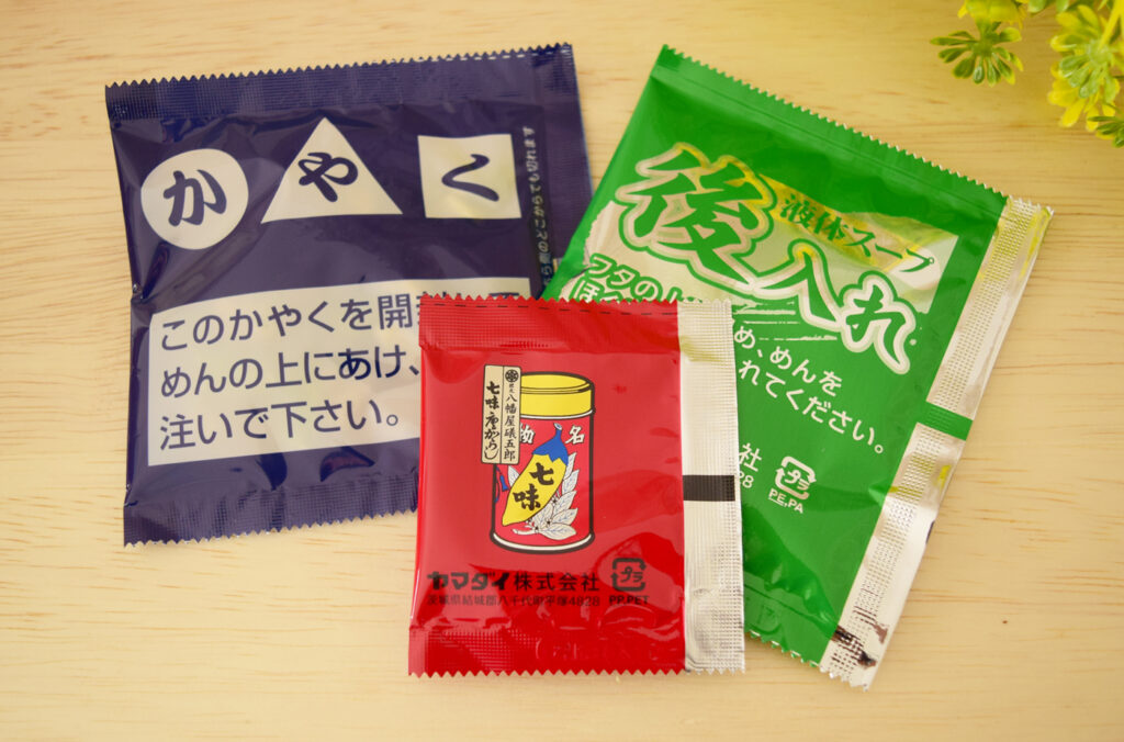 後入れの液体スープとしめじや野沢菜などが入ったかやくが七味唐辛子と一緒に入っています。