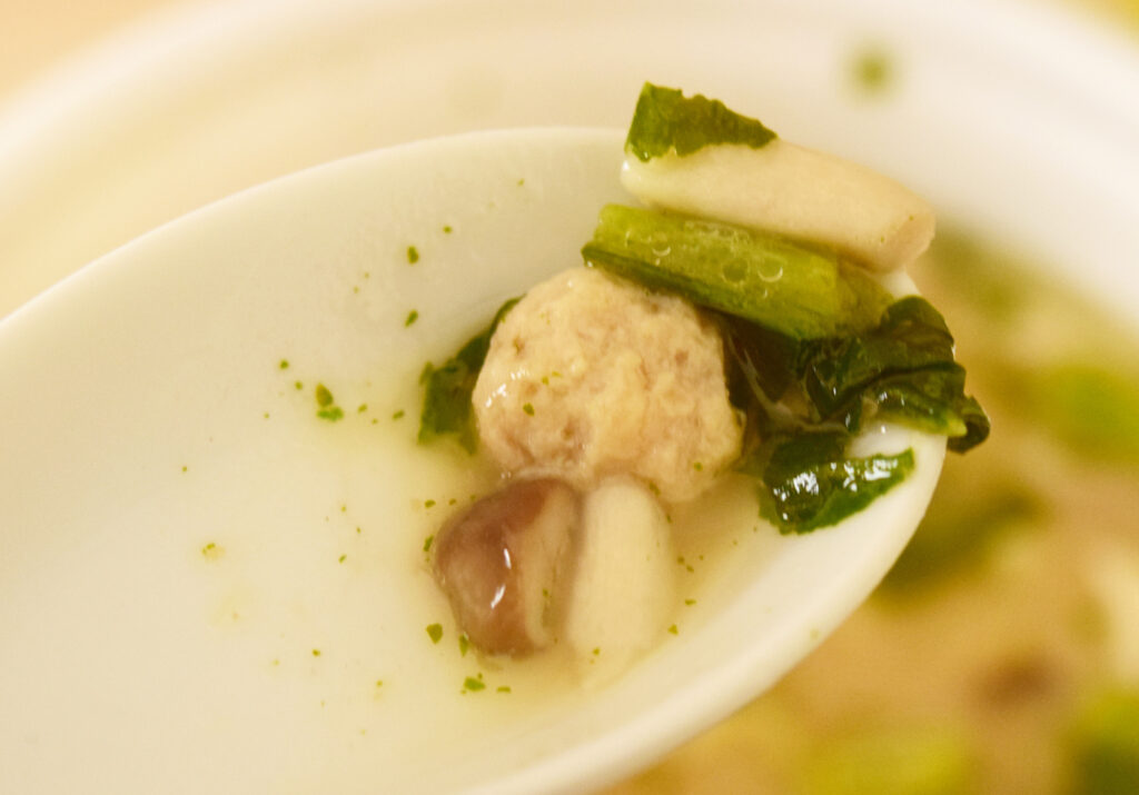 肉団子は少々塩気があります。しめじや野沢菜は量が少なすぎて、存在感が薄め。
