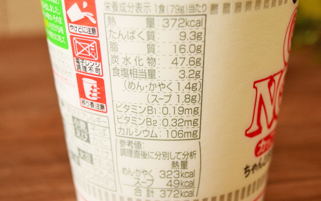 1食あたりの食塩相当量がめん・かやく1.4g。スープが1.8gとすべて合わせても3.2g程度まで抑えています。従来品よりも塩分30%カットされてます。塩分をここまでカットして美味しいのか気になるところですね。実際に食べてみました。