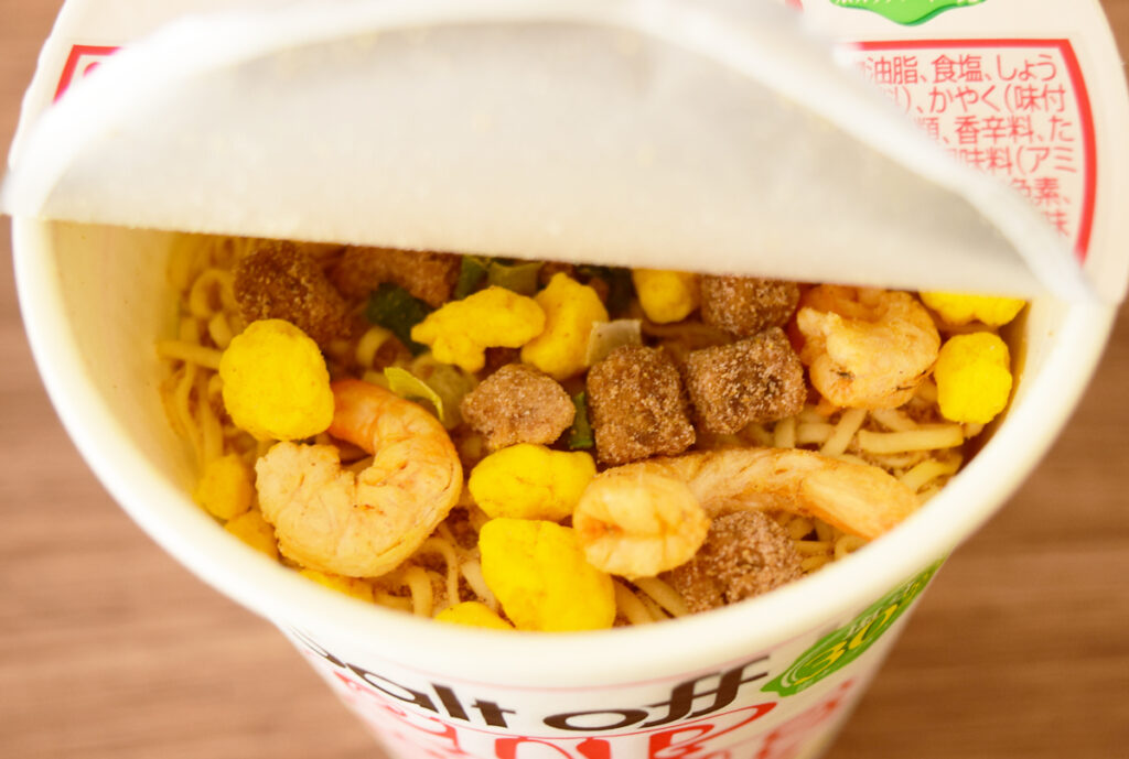減塩とはいえ、具材はけずられていません。見た目は普通のカップヌードル。