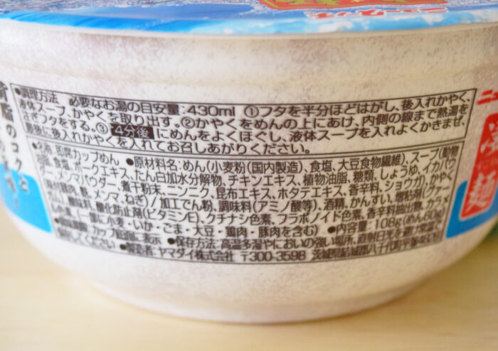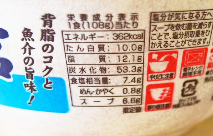 1食(108g)あたり362kcal。食塩相当量7.4g(めん・かやく0.8g、スープ6.6g)でした。