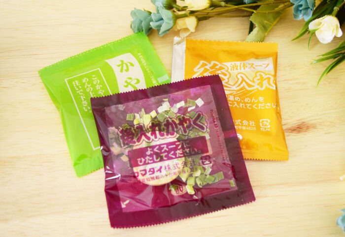 後入れ液体スープと2種類のかやくが入っています。かやくのうち1種類は麩です。