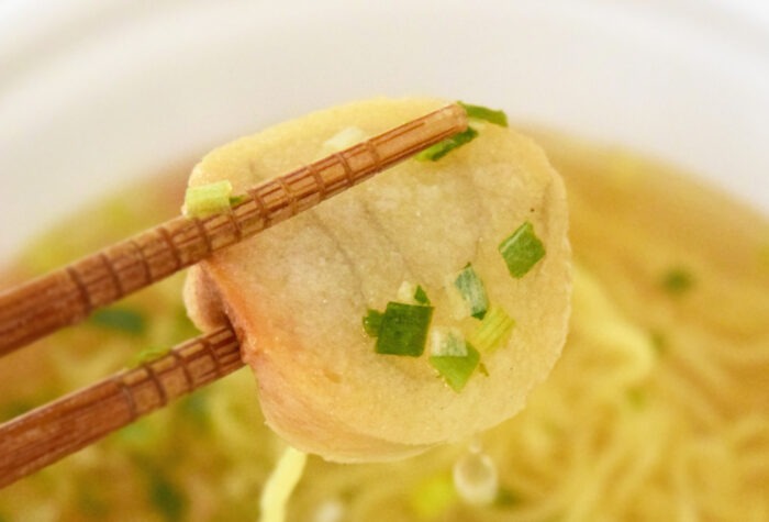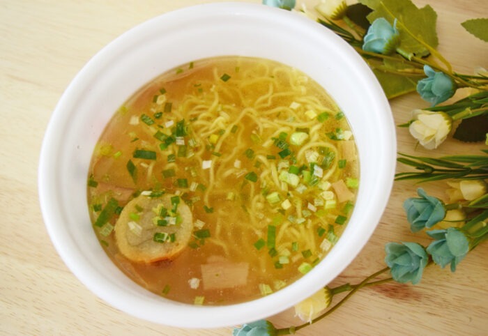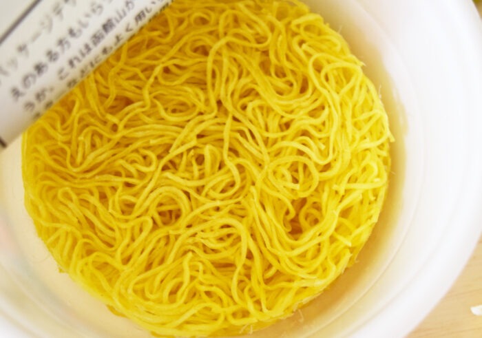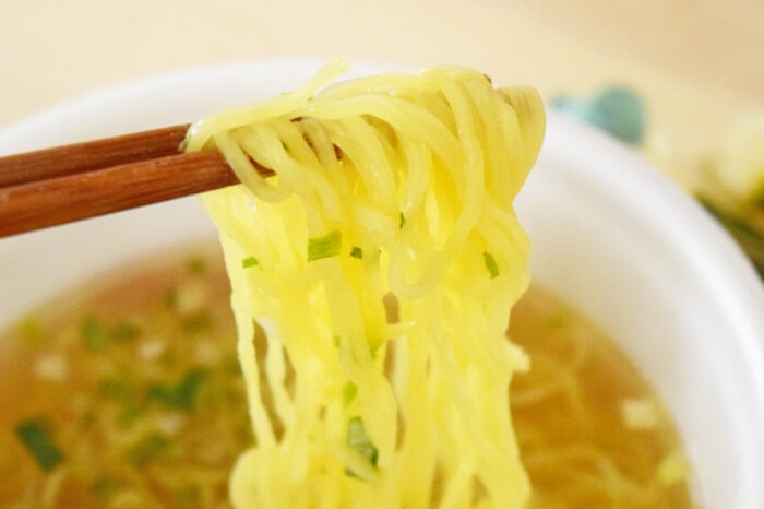 まずはスープから一口。濃厚なポークとチキンの出汁がしっかり効いていて、インスタントぽさが全くありません。カップラーメン塩味は化学調味料の味が強くなりがちですが、このスープはラーメン屋に匹敵するくらい。