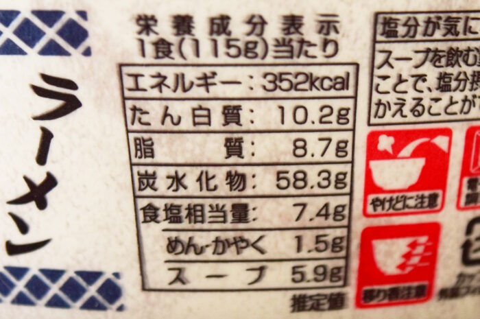 1食(115g)あたり352kcal、食塩相当量は7.4g(麺・かやく1.5g、スープ5.9g)でした。