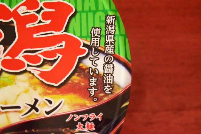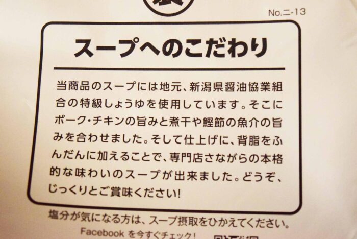 ふたの裏にスープについて詳しく書いてありました。新潟県醤油協業組合の特注醤油を使用していてポーク・チキンの動物系と煮干し・鰹節の魚介系の出汁をあわせたダブルスープが特徴。もちろん背脂ものっているとのこと。