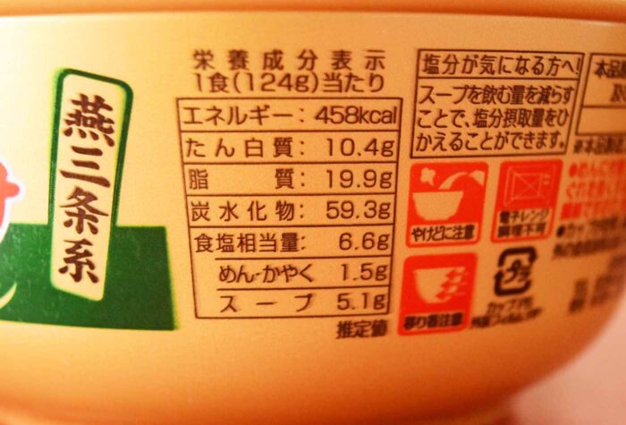 1食(124g)458kcal。炭水化物は59.3gで食塩相当量は6.6g(めん・かやく1.5g、スープ5.1g)。