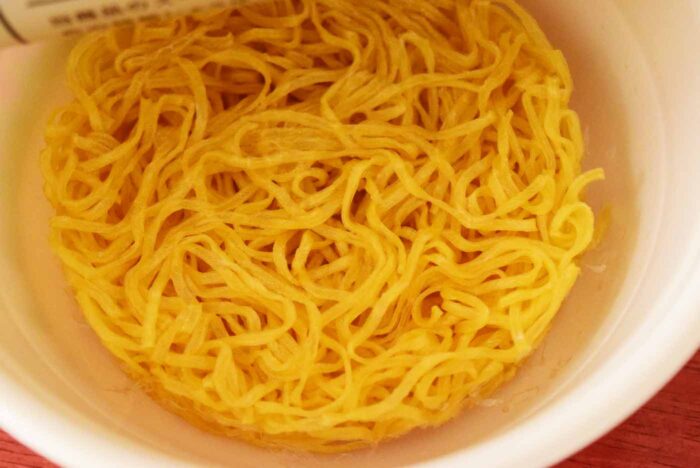 麺の湯戻し時間は5分です。ノンフライ麺なので湯戻しに時間がかかります。