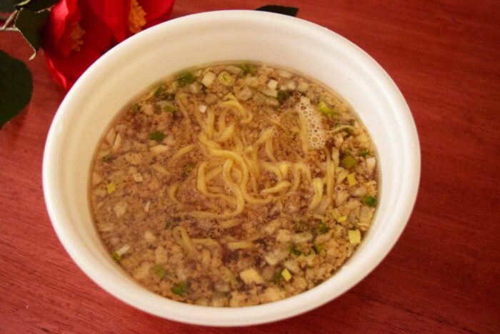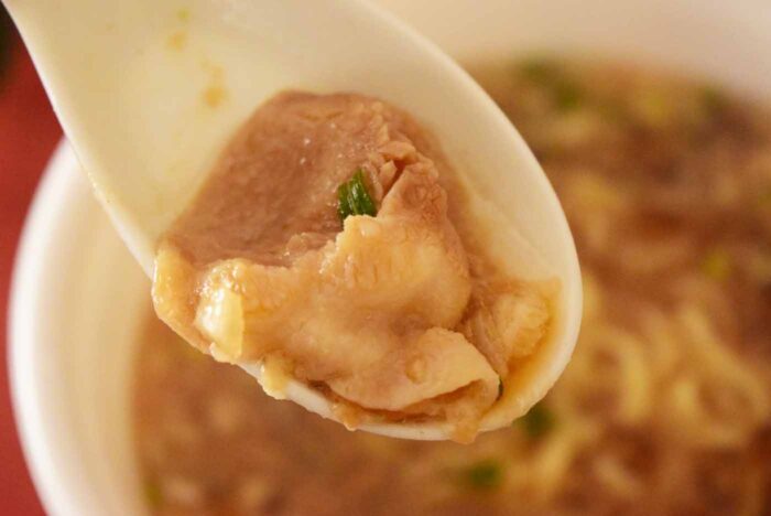 背脂が浮いたスープは本格的でカップラーメンとは思えない出来栄えです。すっきりとした醤油味と動物系の出汁がよく出ています。魚介系の出汁も後から感じられ、ダブルの美味しさです。表面に浮いている背脂は結構多く、スープから湯気が立たないほどでした。
