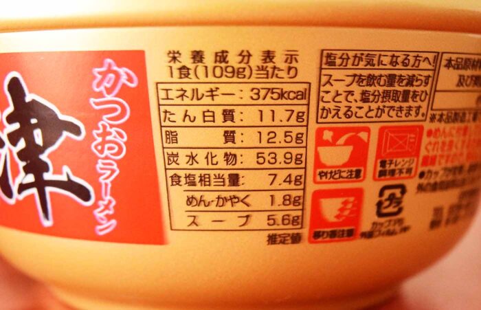 1食(109g)当たり375kcal。炭水化物は53.9gで食塩相当量は7.4g(めん・かやく1.8g、スープ5.6g)。