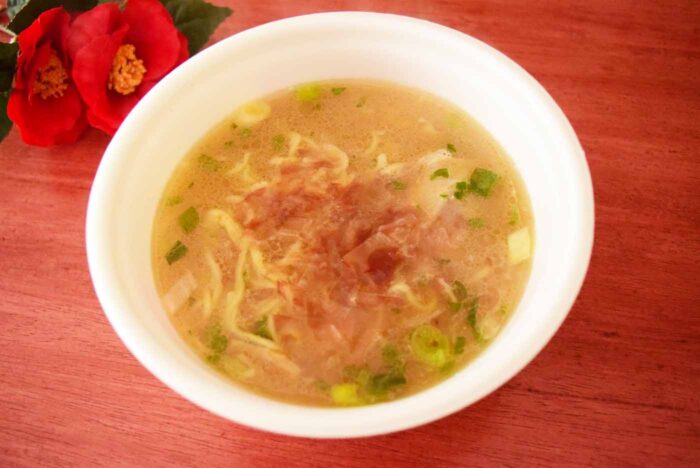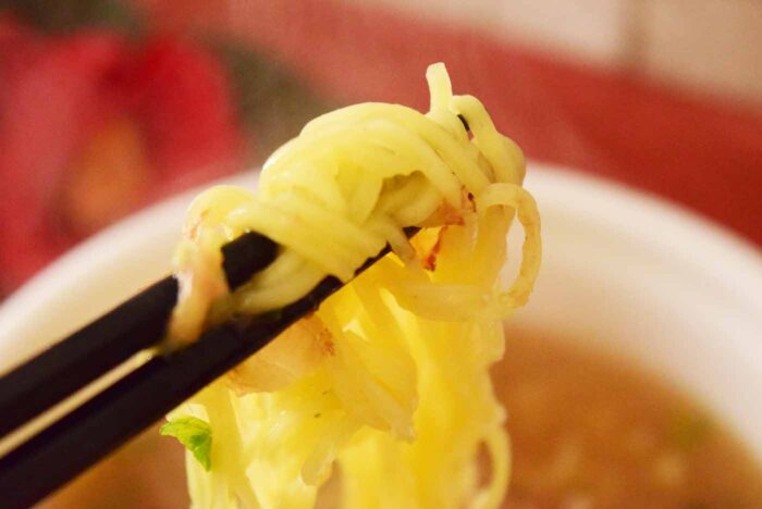ノンフライの細麺はコシがあり、ツルツルとした食感が醤油スープと合っていて心地の良いおいしさ。ノンフライ麺は油っこくないため、鰹出汁が効いたすっきりスープの味を阻害しないのがいいですね。