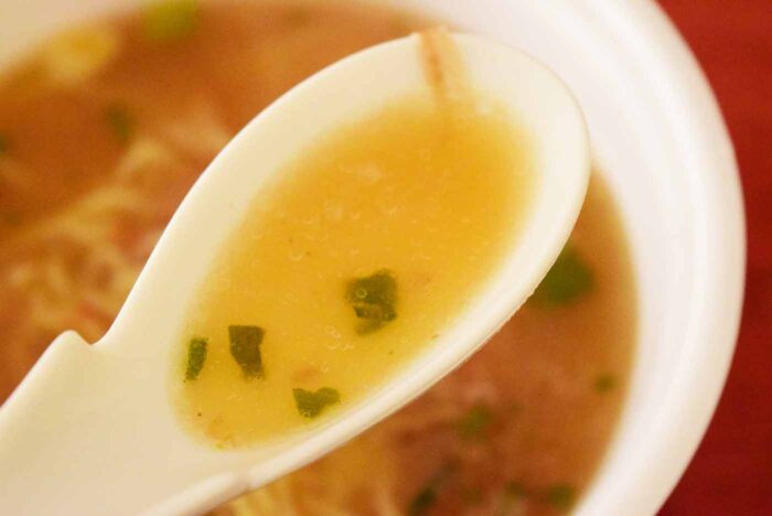 まずはスープから。鰹節のいい香りが鼻を抜けていき、すっきりとした醤油の味とマッチしています。動物油脂やポークエキスなど動物系のエキスが多めに入っていますが、味わいは魚介系の方が強い。鰹節がかなり効いているからですかね。食塩もそれなりに入っていますが、出汁が強いため味の濃さは気になりませんでした。