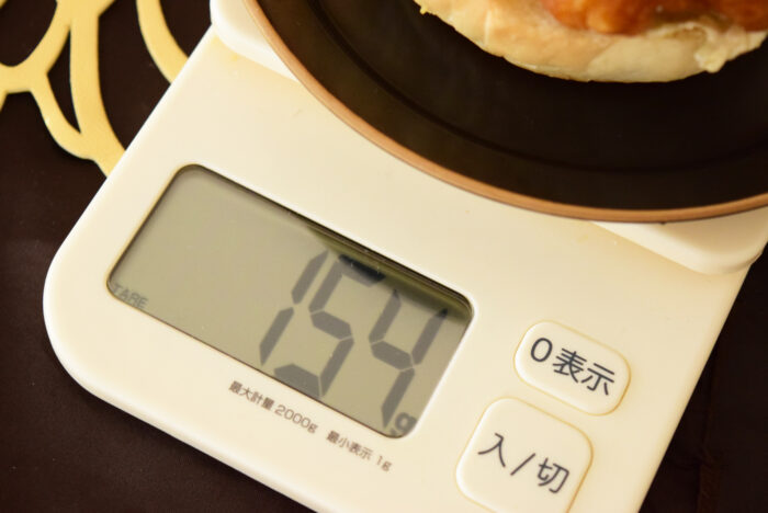 1個当たり154gでした。139gのマックのスパチキよりも多少重いです。