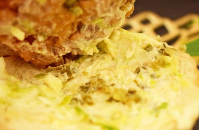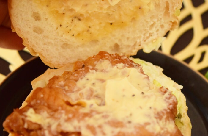 チキンとバンズの間にキャベツマヨネーズ和えが挟まっています。