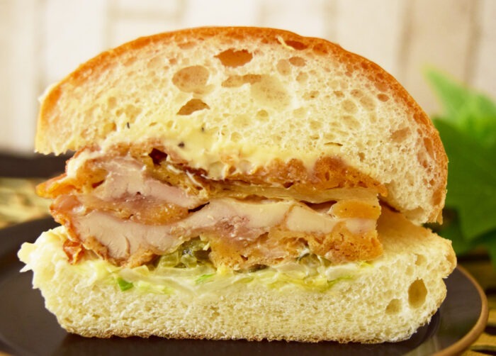半分に割ってみると、チキンが分厚い!口に入れたらすぐに胡椒の香りが広がっていきました。バンズは軽くサクッとした食感がいいです。