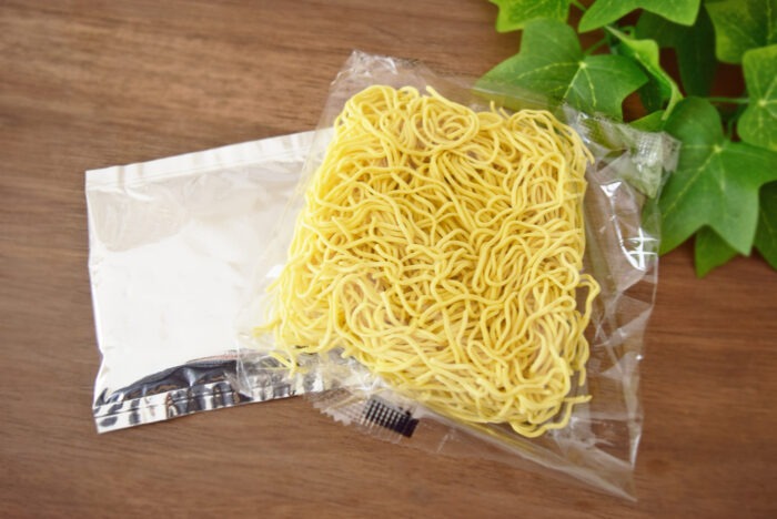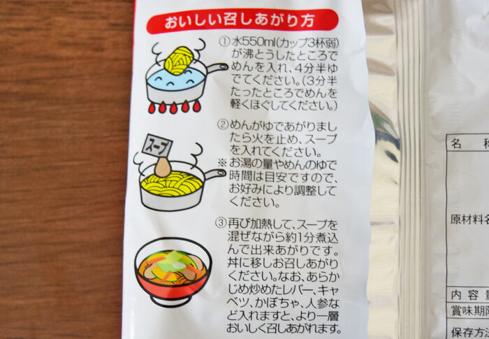 パッケージの中には乾麺と液体スープが入っています。鍋で4分半ゆでて、3分半の時点で軽く麺をほぐすといいみたいです。スープを入れて弱火で1分煮込んだら完成です。