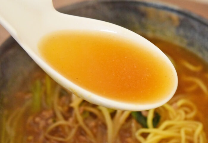 まずはスープから。甘辛風味のスープは中華風餡かけスープっぽい。冷凍食品の横浜あんかけラーメンに近いスープです。