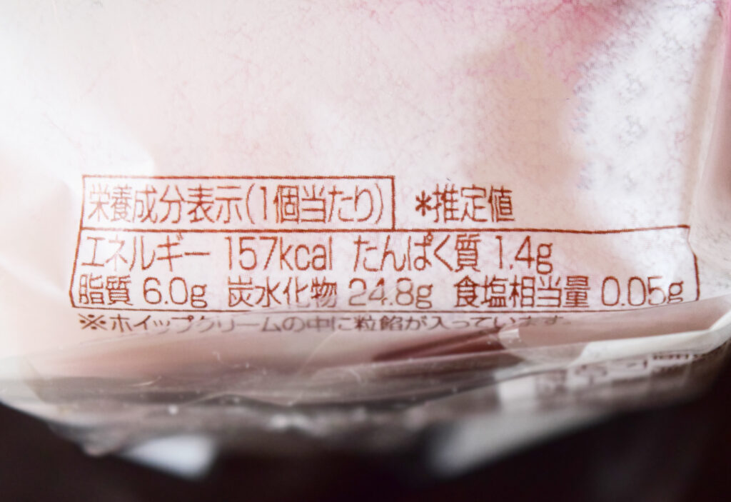 1個あたり157kcalで炭水化物は24.8gです。公式HPによると「ピンク色に色付けしたやわらかくフワフワの雪平生地で、長野県産すずあかねの一粒苺と粒餡・生クリームを加えたホイップクリームを包んだクリーム大福です。」とのことでした。