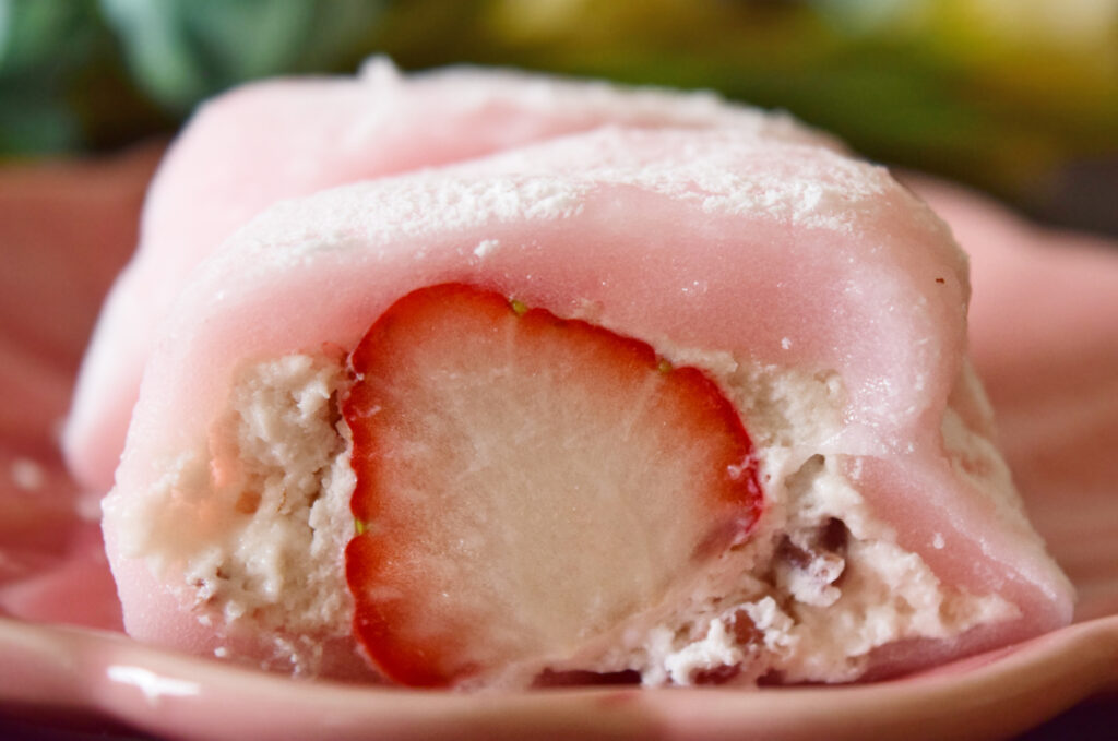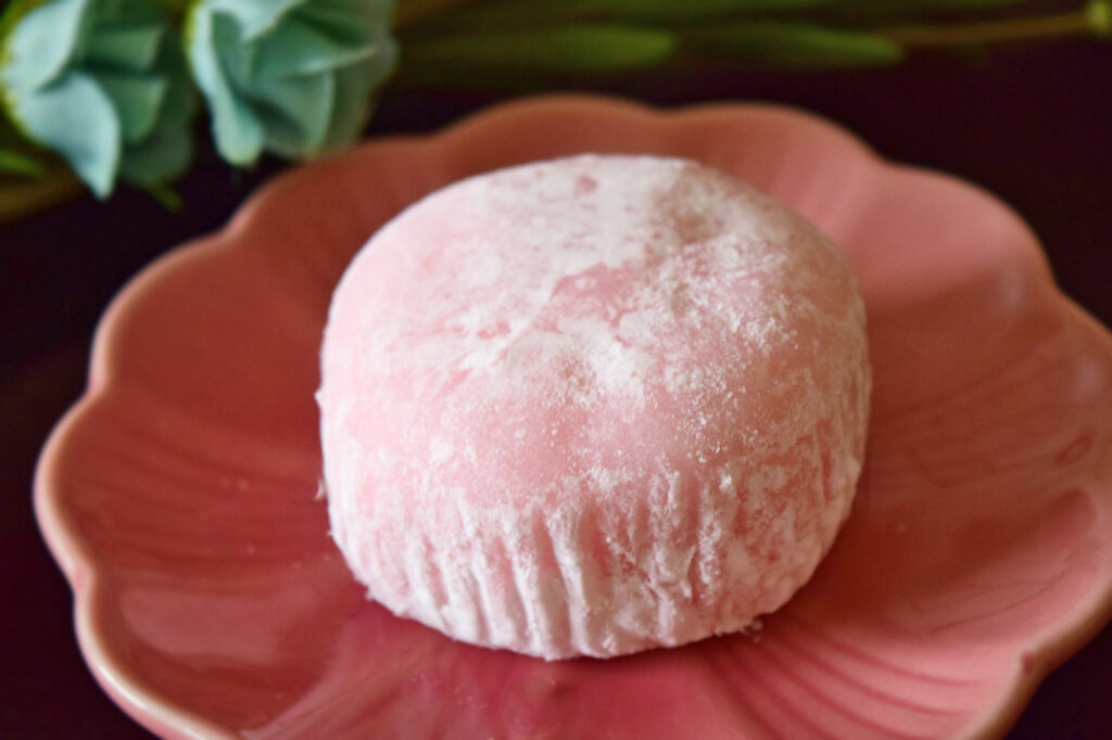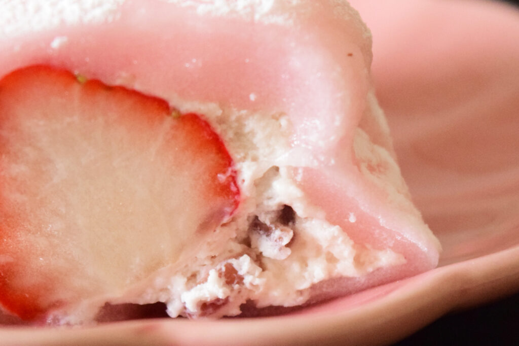 ピンク色が鮮やか。大福生地はふんわり・もっちりとしていて、手にくっつきやすいので注意を。筆者はこの状態でお皿の上に5分ほどのせていたところ、お皿に大福生地がくっついてしまい、食べる時は形が崩れてしまいました。包装を開けたらすぐに食べた方が良いですね。