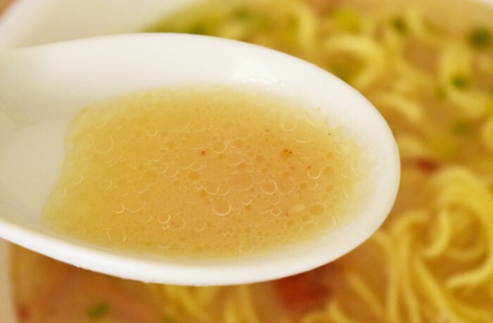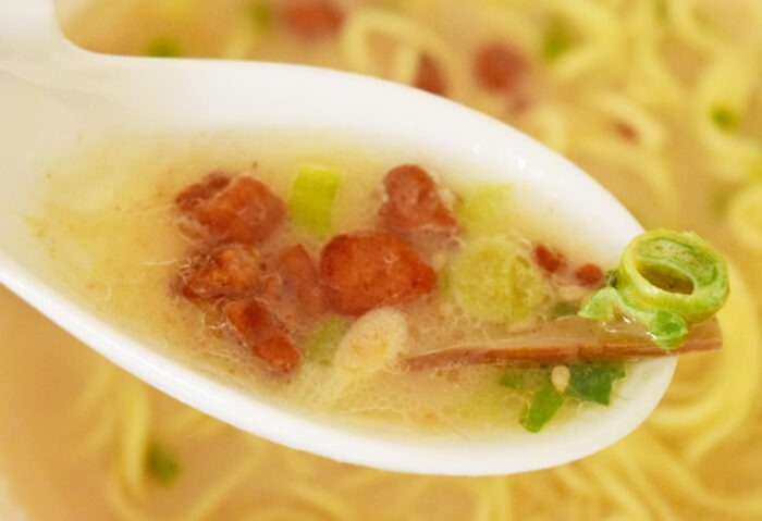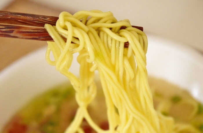 豚骨ラーメン屋で嗅いだことあるような、豚の匂いが鼻を通り抜けるスープ。とっても濃厚。豚骨ラーメン屋で飲んだことあるような濃厚な豚骨の味わいです。筆者は豚骨のカップ麺は2026年まで数多く食べてきましたが、本商品より濃厚でコクのあるスープは出会ったことないですね。