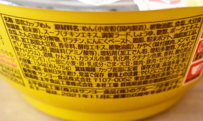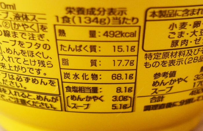 1食(134g)あたり492kcal。炭水化物は68.1gで食塩相当量は8.1g(めん・かやく3.0g、スープ5.1g)。
