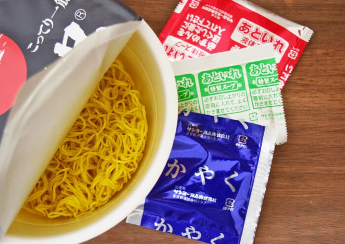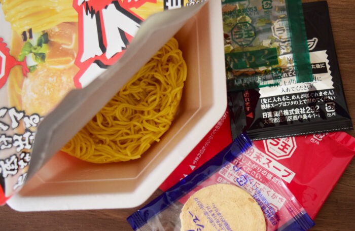 カップの中には麺の他に後入れ液体スープと粉末スープ、かやくが入っています。