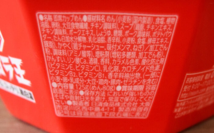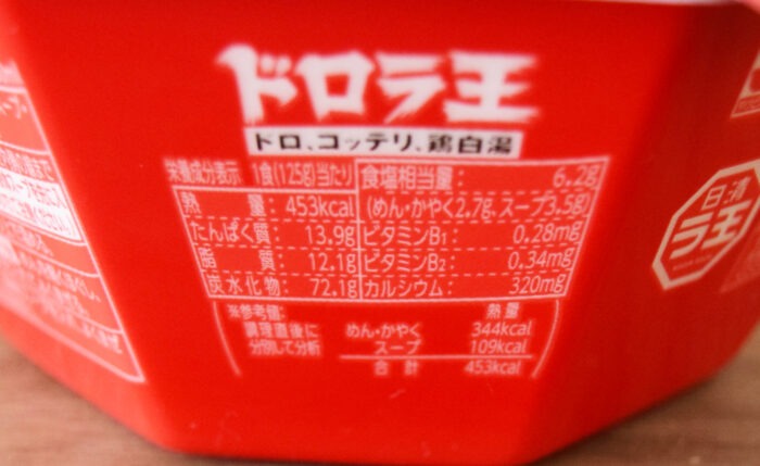 1食(125g)あたり453kcal。炭水化物は72.1gで食塩相当量は6.2g(めん・かやく2.7g、スープ3.5g)でした。天下一品と比較するとカロリーと食塩は低く、炭水化物は若干高いですね。