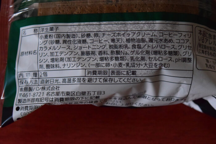 原材料は小麦粉(国内製造)、砂糖、卵、チーズホイップクリーム、コーヒーフィリング(砂糖、異性化液糖、コーヒー、寒天)、植物油脂、還元水あめ、ココア、カラメルソース、ショートニング、脱脂粉乳、食塩/トレハロース、グリセリン、加工デンプン、膨脹剤、香料、酢酸Na、ゲル化剤(増粘多糖類)、グリシン、増粘剤(加工デンプン、増粘多糖類)、乳化剤、セルロース、pH調整剤、酸味料、ナリンジン、(一部に卵・小麦・乳成分・大豆を含む)を使用しています。