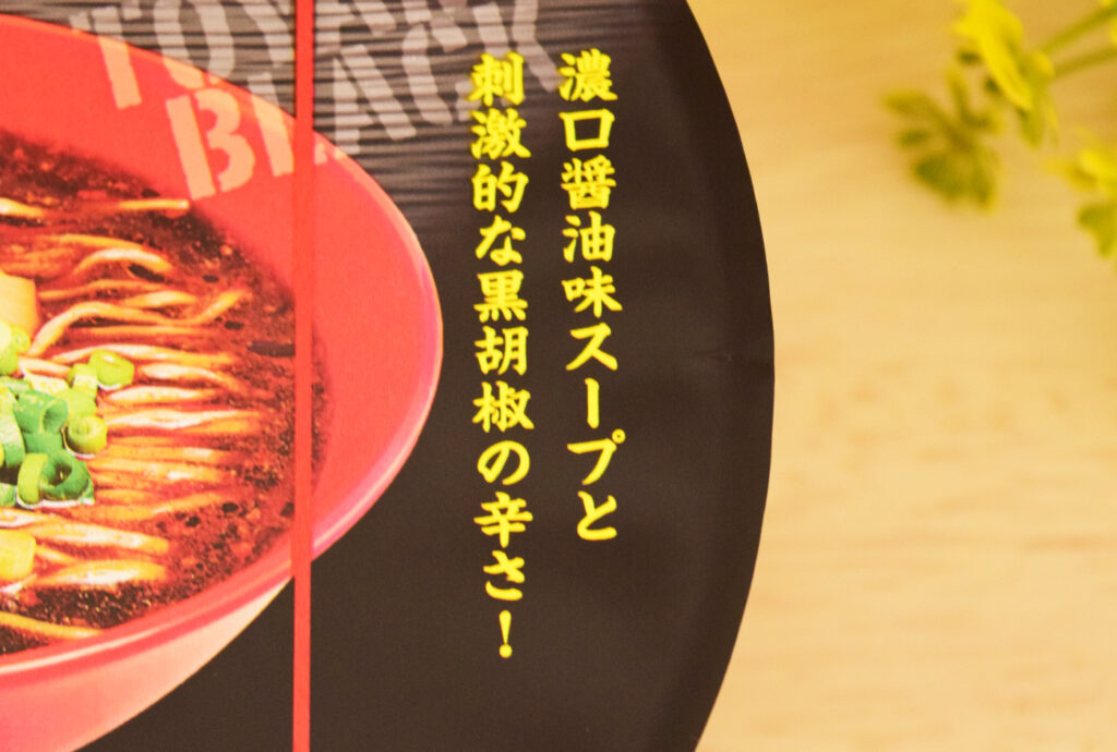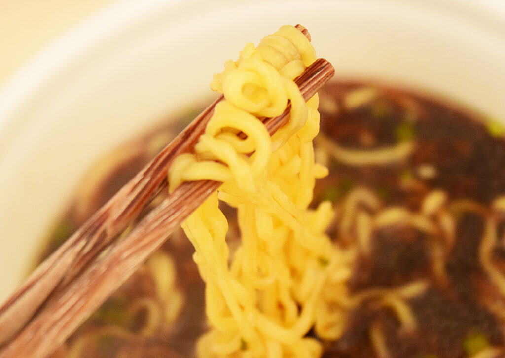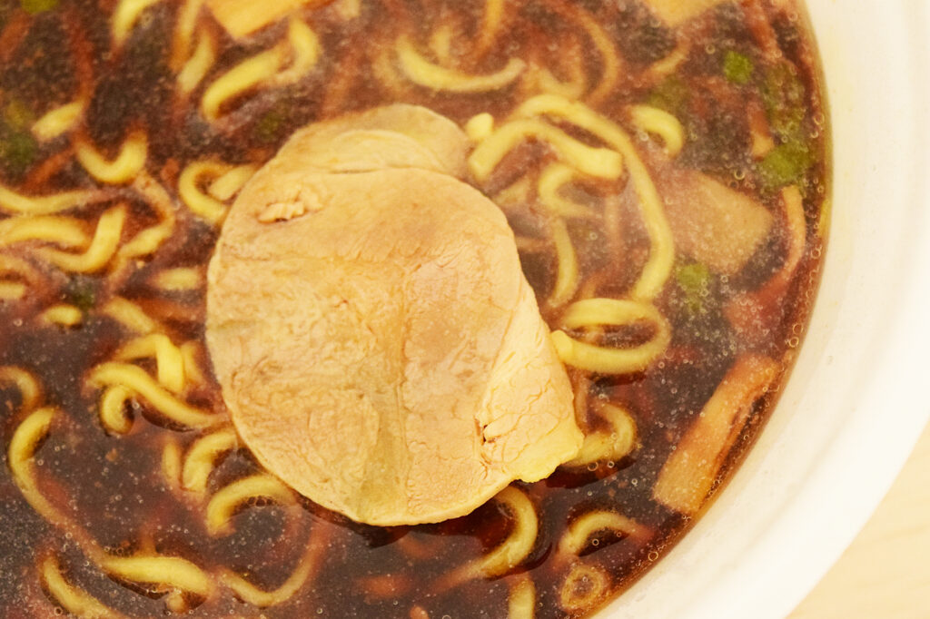 スープは醤油味というよりか、黒胡椒のスパイスが効いています。食塩相当量をみると塩っ辛いイメージでしたが、そこまで塩っぽい辛さはなく、胡椒の辛さの方が気になりますね。