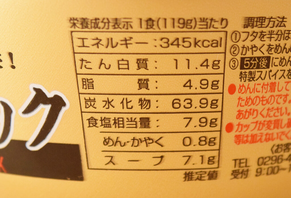 カップラーメンとしては非常に塩分が高いですが、麺が0.8g・スープが7.1gとスープに塩分のほとんどが含まれているため、スープを残せば塩分を気にする人も一安心できそうです。