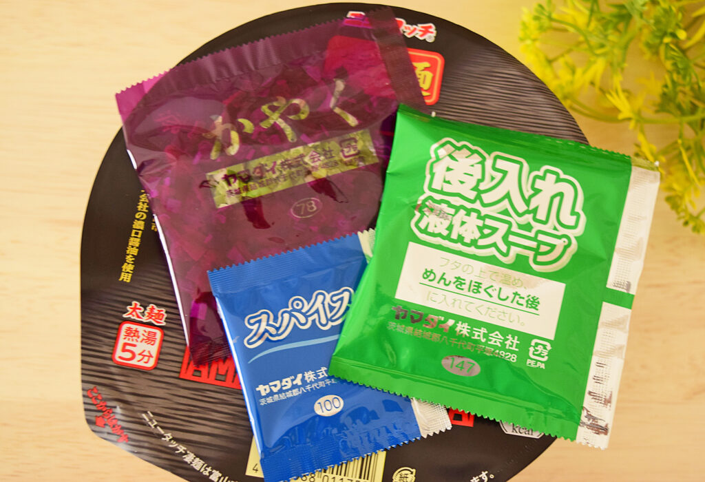 かやくと後入れスープ、スパイスが別梱包で入っています。