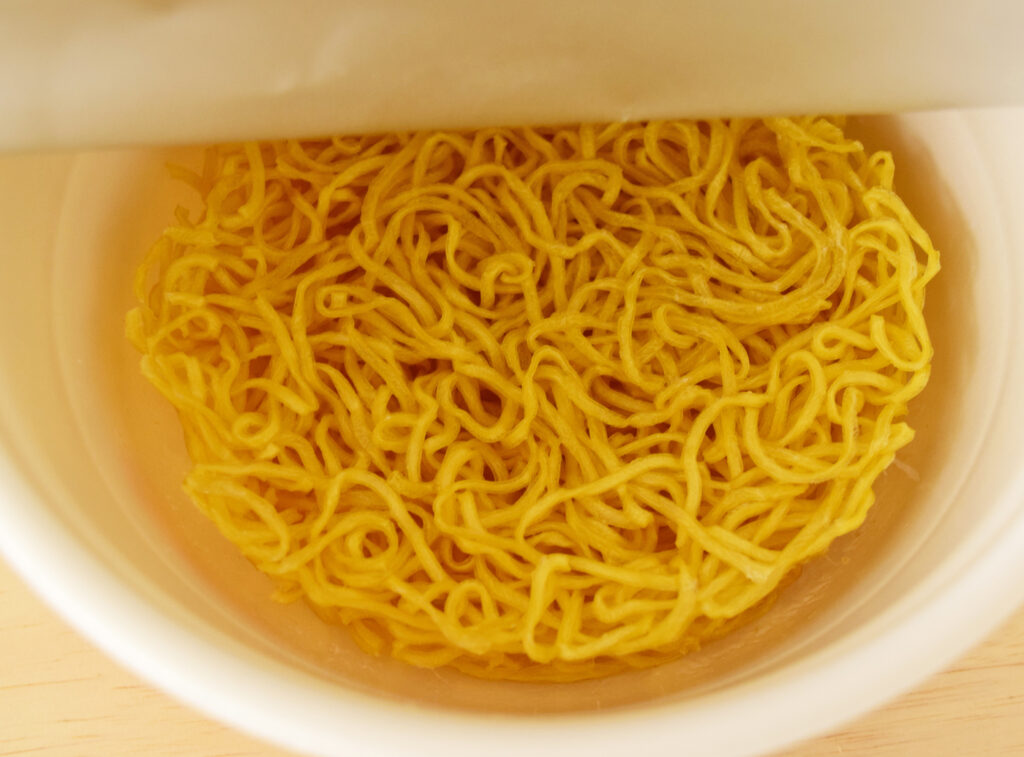 ノンフライ麺。お湯を入れて5分後、スープとスパイスをいれたら完成です。