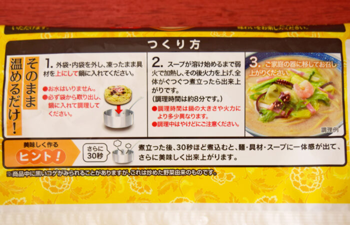 調理方法はいたって簡単。外袋&内袋を外して凍ったままの具材を鍋に入れてある程度溶けるまで弱火で煮込み、溶け始めたら火を強めるだけで完成します。調理時間は約8分。