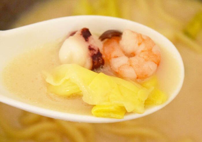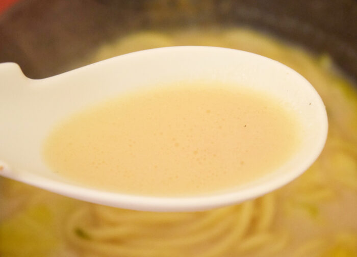 鶏白湯スープはクリーミーで柔らかい味わい。胡椒などの味はそこまできつくなく、豚骨や鶏などのまろやかさと野菜の甘みを前面に出した味になっています。ついついスープを飲み過ぎてしまうほどの美味しさです。