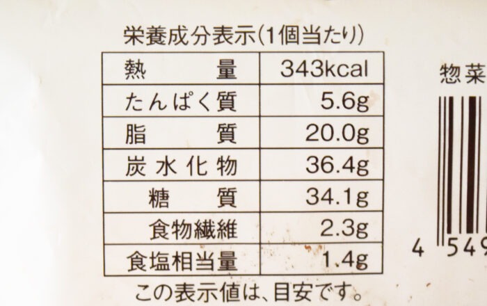 1個当たり343kcal。糖質は34.1gで食塩相当量は1.4g。