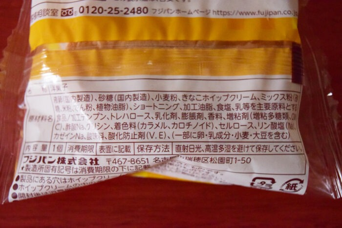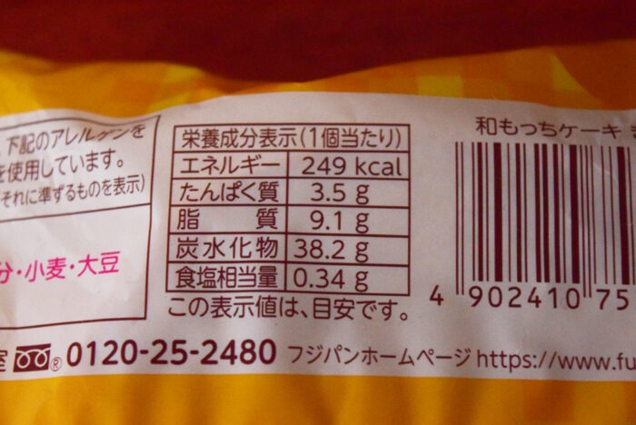 原材料は液卵・砂糖・小麦粉・きな粉ホイップクリーム・ミックス粉(果糖・米粉・でん粉・植物油脂)ショートニング・加工油脂・食塩・乳等を主要原料とする食品など含まれています。