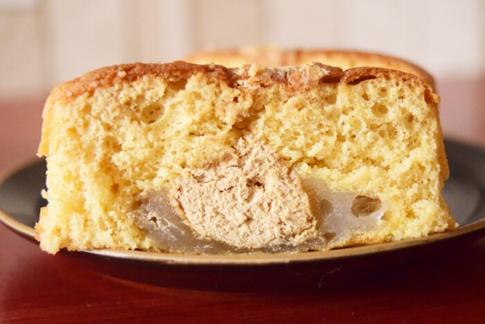 なかにはきなこクリームとおもち風生地がびよーんと伸びてやわらかいです。きなこクリームはさほど量が入っていませんが、香りはそれなりに強いのが特徴。ふわふわの生地ともっちり生地にきなこの香りが合わさり非常に美味しいです。
