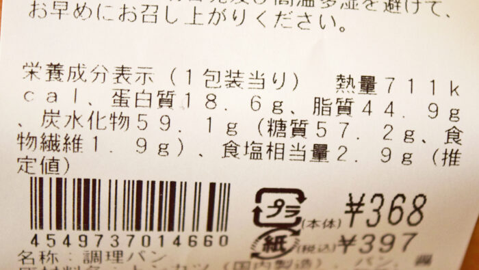 1個当たり711kcal。糖質57.2gで食塩相当量は2.9gです。マクドナルドのメガマフィンよりカロリーが高いですね。(メガマフィンは695kcal)